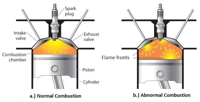 Knocking (also referred to as pinging) happens when the petrol is too "unstable" for your specific engine. Instead of waiting for the spark plug to light it at the perfect time, the fuel gets incredibly hot and ultimately under pressure explodes too early. Imagine that bicycle rider again. Knocking is like someone hitting the rider's foot with a hammer while their leg is still moving upward.